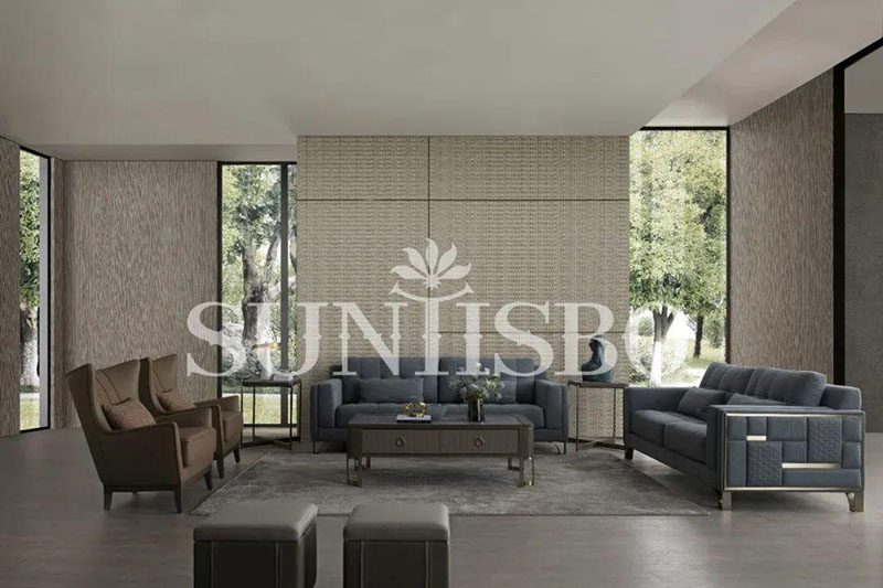 沙發(fā)采用細(xì)膩的顆粒感皮料,不僅增加了霧霾藍(lán)色彩的飽和度,也在視覺上充實(shí)了空間的安全感。輪廓,扶手皆為干練利落的直線,放眼望去不僅簡化了空間,也傳達(dá)著對精簡生活的追求。