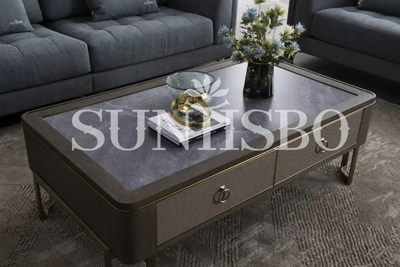 茶幾桌面采用仿巖板質(zhì)感的巖玻,既保留了鋼化玻璃的超強(qiáng)硬度,同時(shí)擁有玻璃的通透感與巖板紋理的現(xiàn)代感。玻璃與巖板產(chǎn)生的撞色,提升了空間的氣韻。