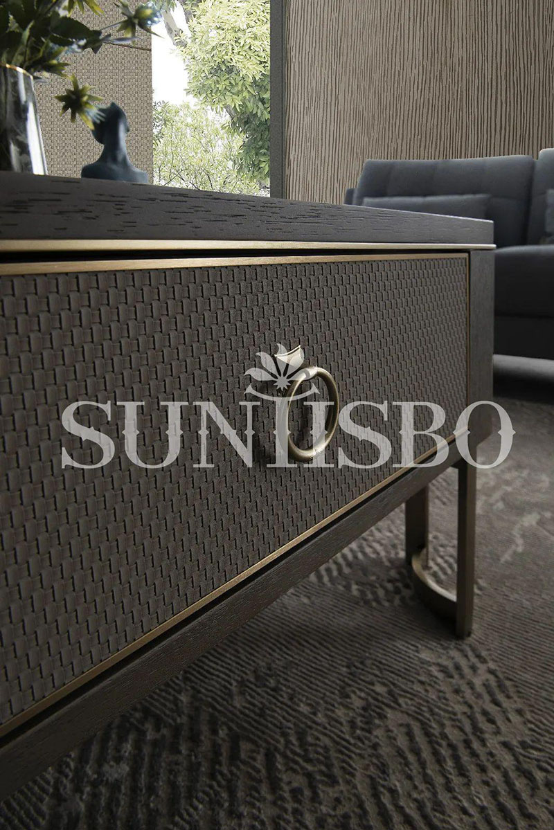 面板鑲嵌的編織紋皮質(zhì)在實(shí)木的基礎(chǔ)上進(jìn)行雕刻,輔以極佳的傳統(tǒng)編織藝術(shù),讓空間倍顯溫潤時(shí)尚感。