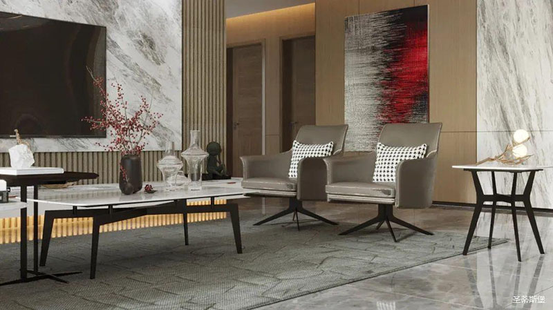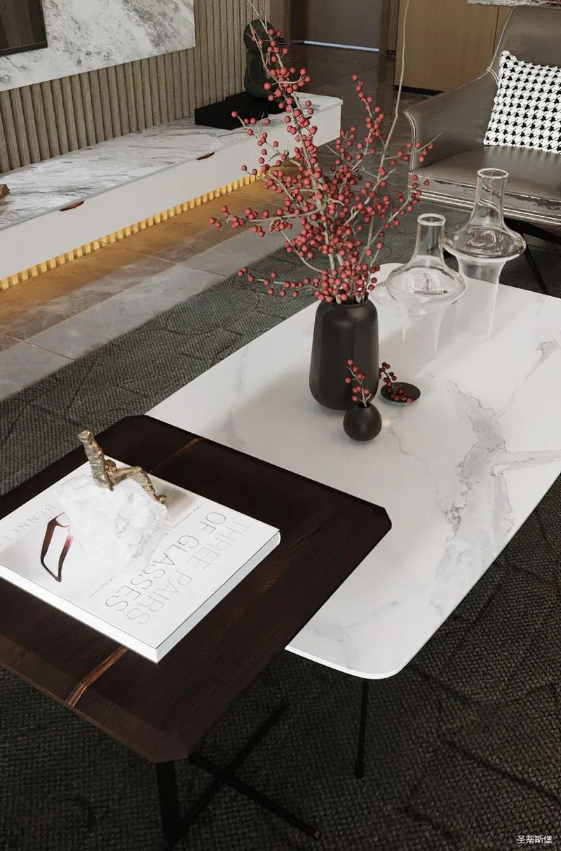 純美的線條,沉穩(wěn)的色澤,為空間定下了低調(diào)而華麗的基調(diào)。渾然天成的實(shí)木與巖板紋理,讓角幾蕩漾出一幅“水光瀲滟”的潑墨油畫(huà)。三兩紅枝點(diǎn)綴,表達(dá)著“枝頭并蒂祝吉祥”的美好祝愿。光影透過(guò)極簡(jiǎn)金屬幾腳,折射出一種隱藏的優(yōu)雅氣質(zhì)。大小、高低不一的天然材質(zhì)角幾組合在一起,時(shí)尚又個(gè)性,不僅便于移動(dòng),還表現(xiàn)的靈活且輕巧。