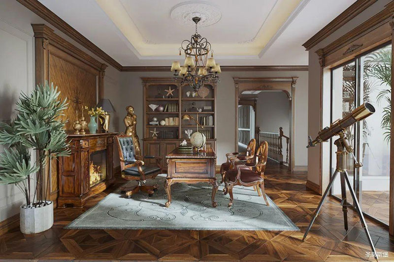 書房護(hù)墻板是由白楓木皮拼接的花鬘圖案,顏色層次分明,立體感超強,營造了滿滿的美式鑲嵌藝術(shù)感。深沉木色邊柜在護(hù)墻板上延伸,逐漸浸染了古銅色的家具和燈飾,結(jié)合著拱形羅馬柱,塑造出端雅大方的環(huán)境氛圍。