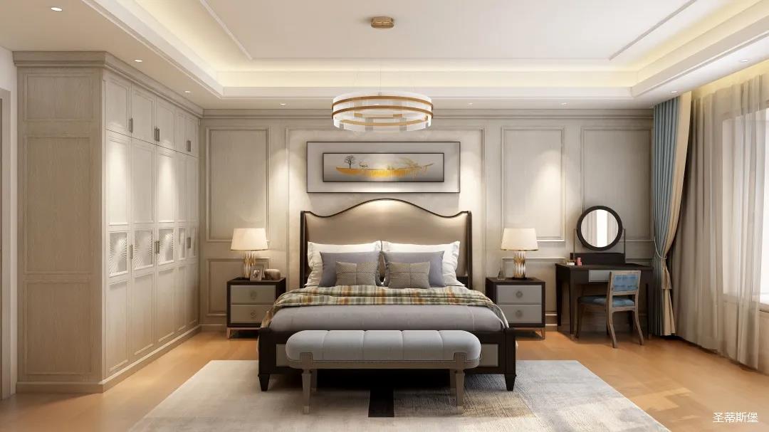 ▲業(yè)主喜歡低調(diào)輕奢的空間格調(diào),設(shè)計(jì)師從功能出發(fā),賦予空間舒適的感受,打造專屬的衣帽間,滿足業(yè)主日常買買買的儲(chǔ)物喜好。同時(shí)也將藝術(shù)元素融入美式現(xiàn)代風(fēng)格,利用空間的色彩、紋理、家具、配飾、光線等表達(dá)空間情緒,再以黃銅金屬加持,營(yíng)造溫馨愜意的家居睡眠氛圍。