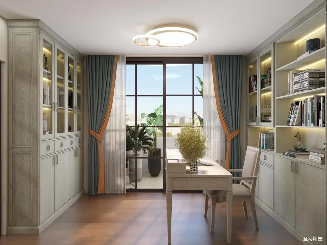 ▲書房設(shè)計(jì)不放過(guò)每一面墻,實(shí)木鋪滿整個(gè)空間,親近自然的靜謐感油然而生,陽(yáng)光透過(guò)玻璃灑進(jìn)來(lái),落在地面上形成斑駁光影,一本喜愛(ài)的書、一杯咖啡、沉浸在閱讀的樂(lè)趣之中,時(shí)光荏苒、歲月靜好。