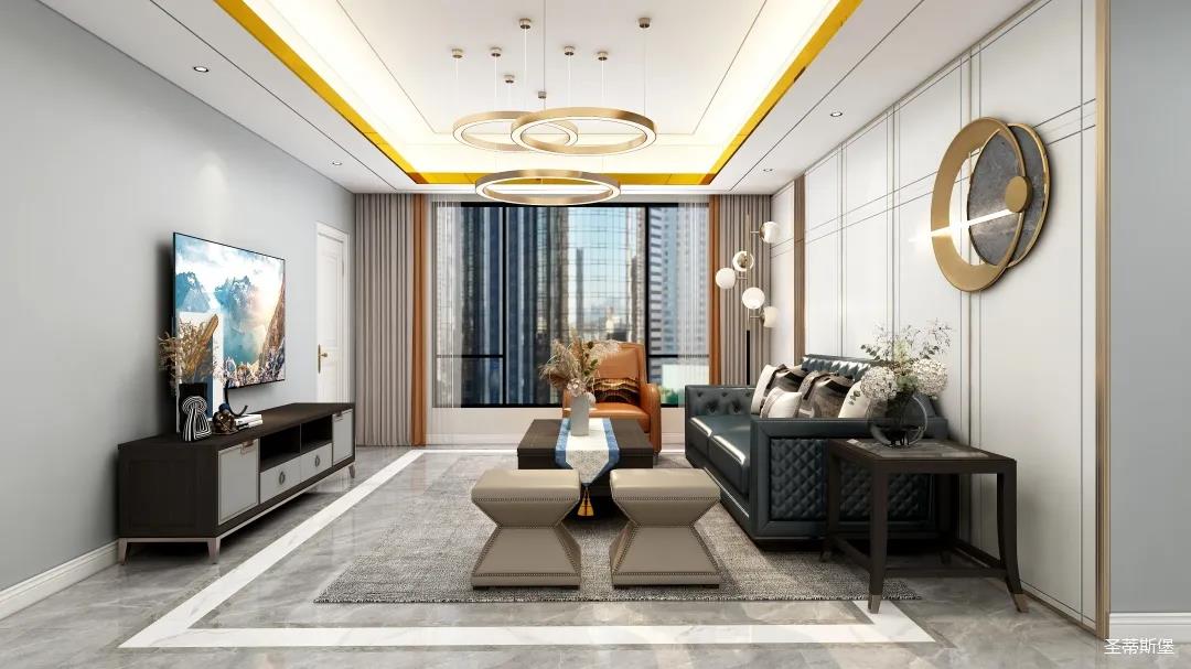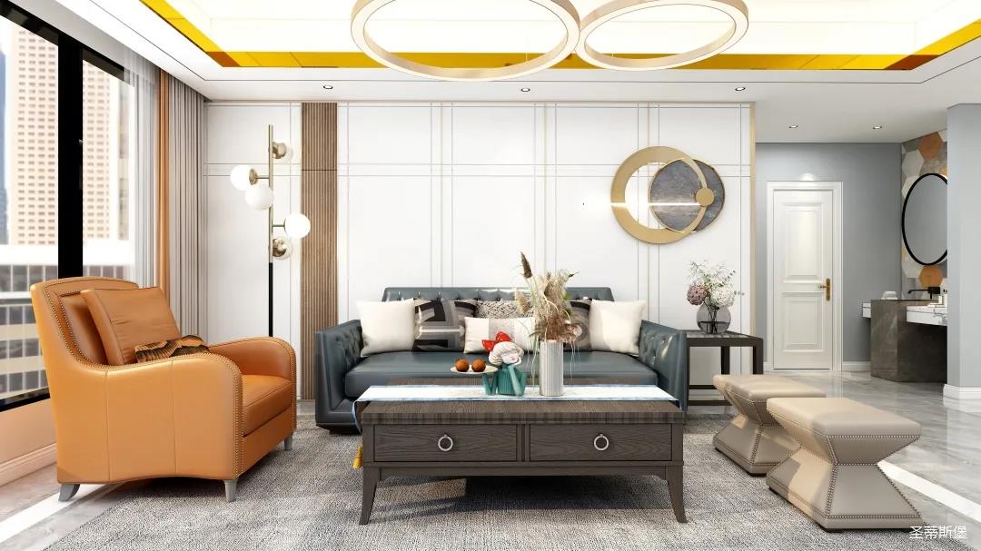 客廳延續(xù)著美式輕奢的氣韻,背景墻被簡約有序的金屬線條分割,營造出質(zhì)感空間的細膩。沙發(fā)沉穩(wěn)又不失時尚,色彩混搭更是讓人耳目一新,展現(xiàn)著美式風格天性自由不羈的浪漫個性。