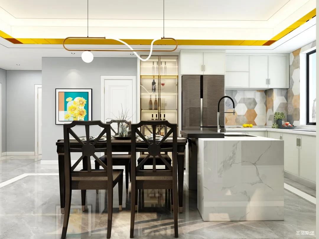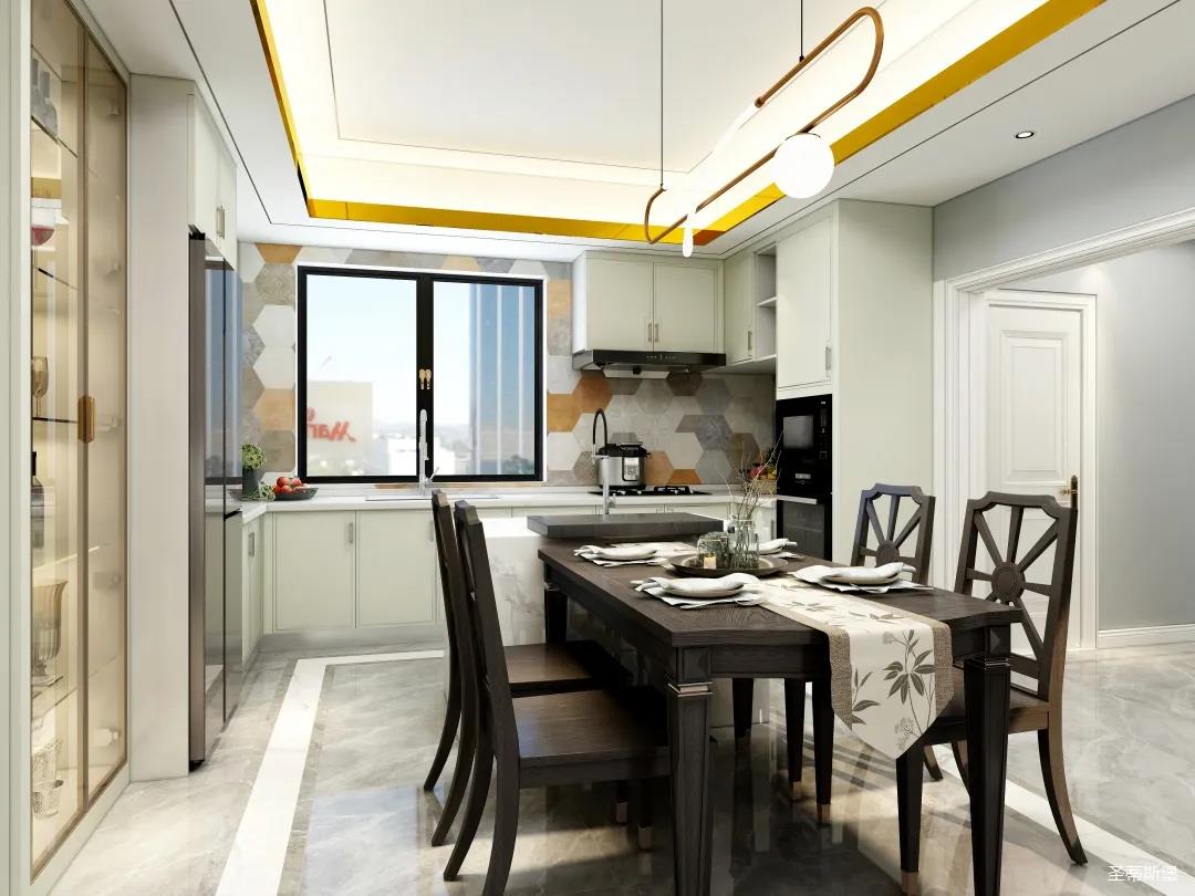 儀式感的餐廚空間,應在自然光影中跳躍。從設(shè)計搭配細節(jié)將美式開放,不設(shè)限的特性顯現(xiàn),實木餐桌線條簡約且剛毅,中島臺鏈接起用餐空間的隨性,不遺余力的拉伸空間的層次感。