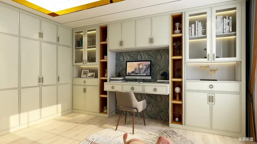 整個空間將對稱美進行到底,雖在設(shè)計思想上有所保留,但呈現(xiàn)的卻是一個擁有秩序感的家,高級的莫蘭迪灰與溫柔的象牙白居中搭配,優(yōu)雅又治愈,能在睡眠上帶來安穩(wěn)與舒適的張力。