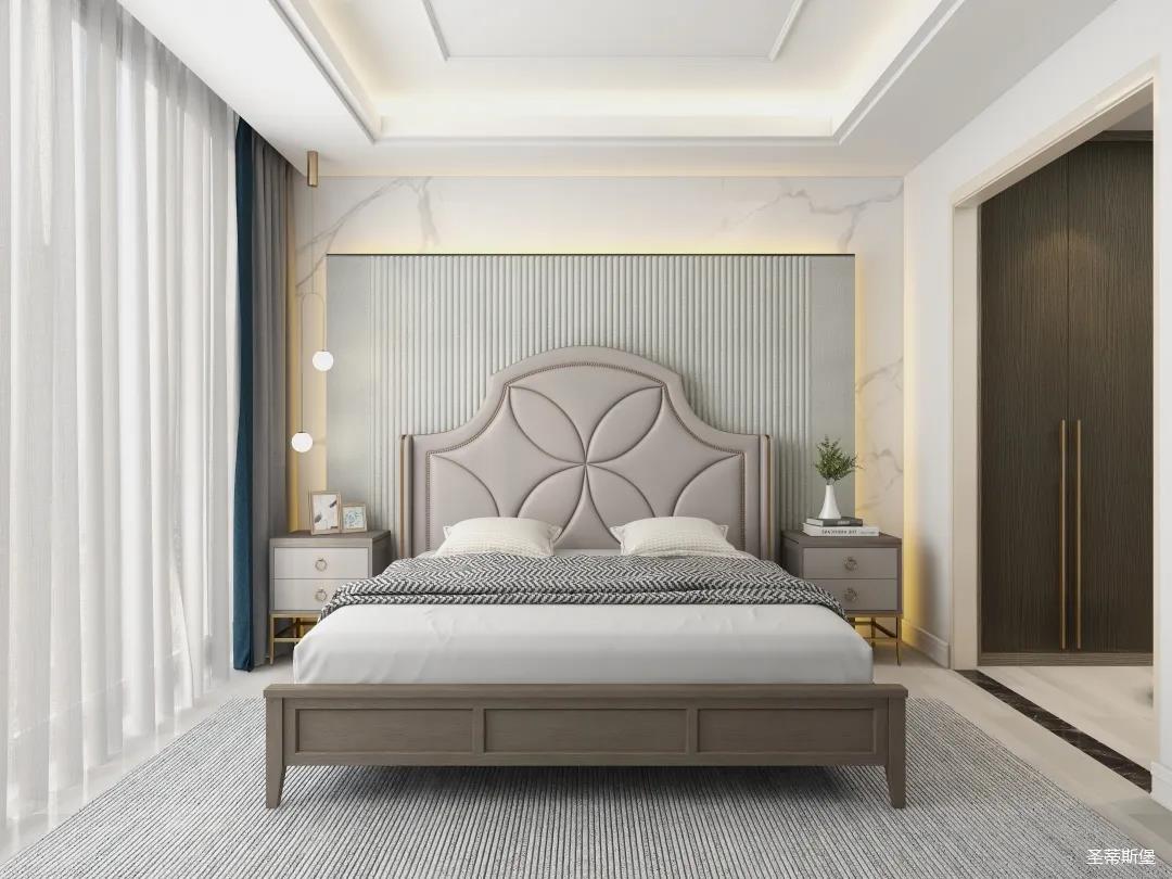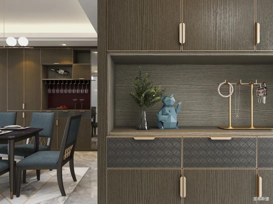 材質(zhì)的交替與光影的變換,具有濃濃的現(xiàn)代簡奢色彩。獨一無二的英倫爵士灰定制柜,由延邊鑲嵌的香檳金拉絲金屬分割,線條流暢且奢華,不僅代表著時尚,也崇尚了實木韻味。設(shè)計師將現(xiàn)代、實用、精致的藝術(shù)設(shè)計風格應用其中,更是精致生活方式的藝術(shù)演繹。在平靜的空間中表現(xiàn)出獨特的藝術(shù)骨感,滿足我們對精致生活的精神追求。