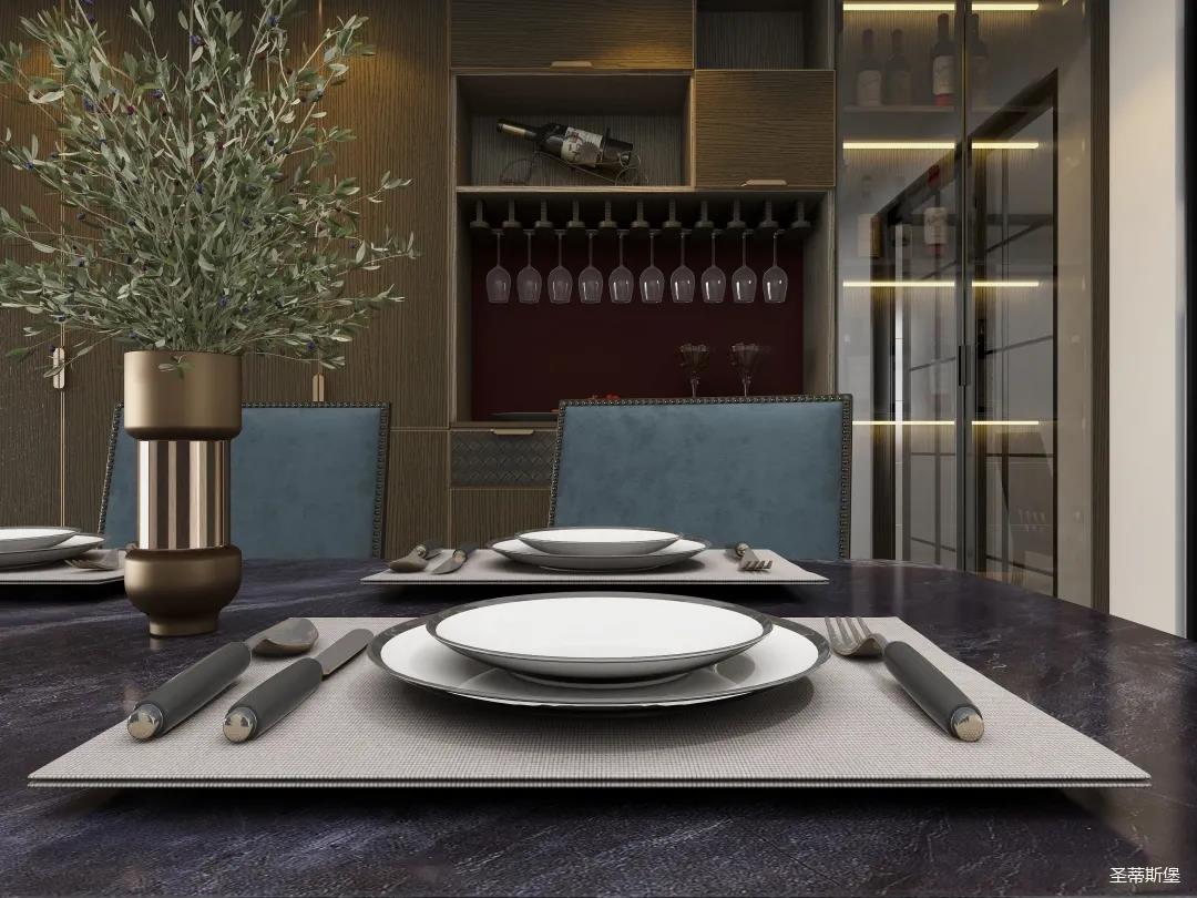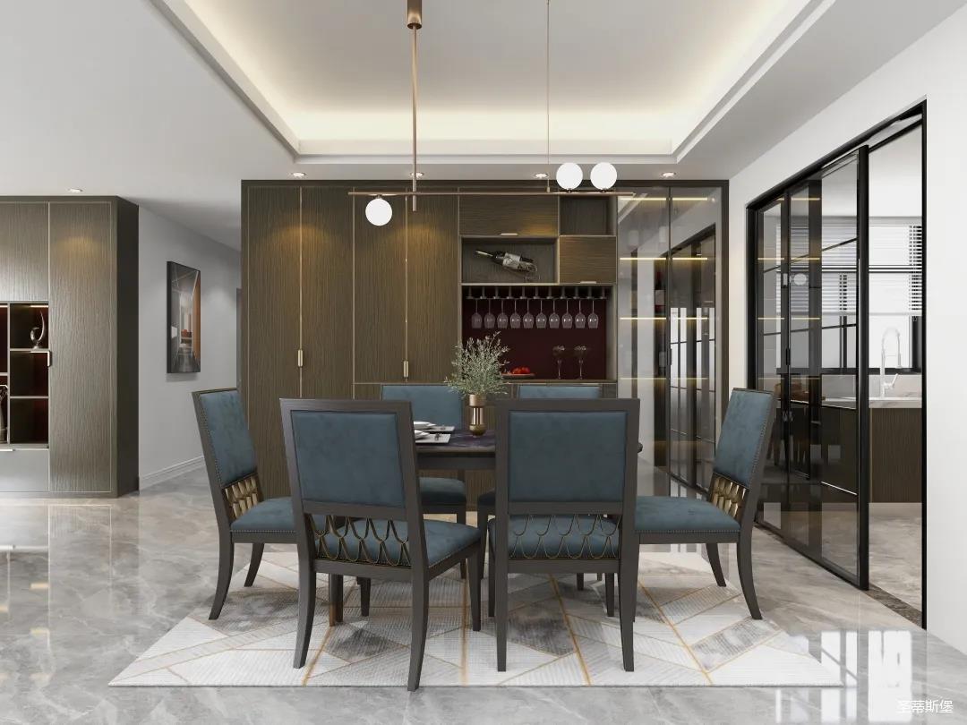 餐廳系統(tǒng)詮釋著材質(zhì)與工藝的質(zhì)感結(jié)合。一字型定制餐邊柜,實木飾面細膩自然,讓就餐空間成為了高級情調(diào)的重點。明暗分區(qū)的設(shè)計構(gòu)造,順勢創(chuàng)造了更多的儲物驚喜。