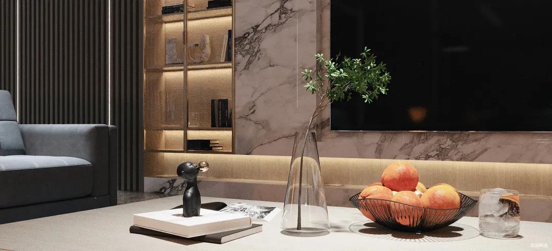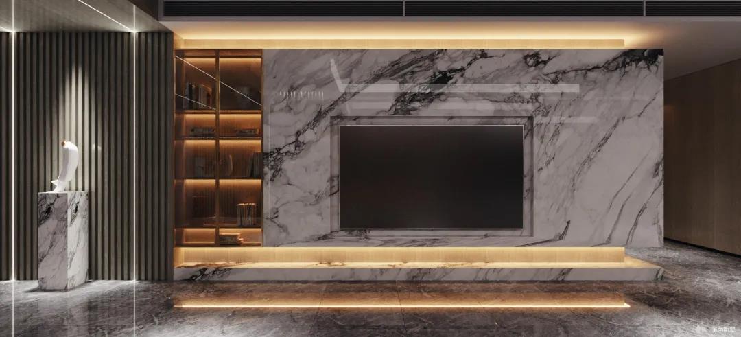 為了減輕現(xiàn)代都市工作的忙碌,客廳設(shè)計(jì)更偏向于對(duì)生活“解壓”的極簡(jiǎn),精選自然紋理的大理石與實(shí)木定制柜做一體化設(shè)計(jì),并在電視背景墻下半部分做挑空設(shè)計(jì),安裝個(gè)性十足的線性燈帶,延伸客廳視覺深度。
