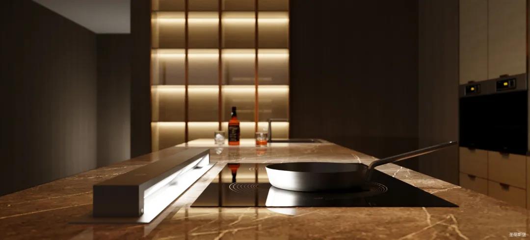 餐廳空間納入了多重材料,金屬、石材、木飾的搭配呼應(yīng)著飽和度較高的軟裝,將都市的舒適感與藝術(shù)氣息融為一體。極簡(jiǎn)的單色線條美感在不同的材質(zhì)中形成明暗對(duì)比,開放式的包容空間格局實(shí)現(xiàn)了隱藏收納和陳列外漏的雙重功能。暖系的層板燈搭配著獨(dú)具特色的烹飪空間,營(yíng)造出具有儀式感的用餐體驗(yàn)。