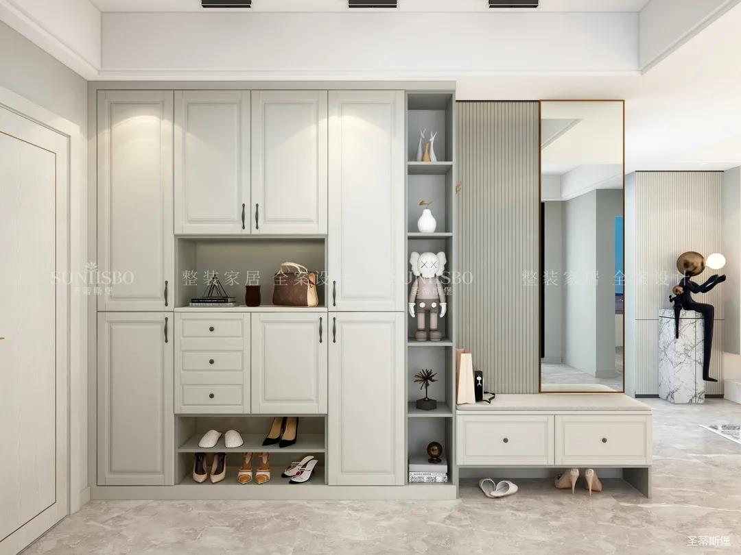 入戶側(cè)面設(shè)計一字型玄關(guān),腰部,底部留空做層板,便于隨手放置鑰匙、鞋包等物品,中間留空設(shè)計為開放展示區(qū),加上軟裝飾品點綴,達到業(yè)主對品質(zhì)生活追求的理想狀態(tài)。應(yīng)女主人要求,玄關(guān)還加長延伸出妝鏡和換鞋凳,讓動線自然流暢。