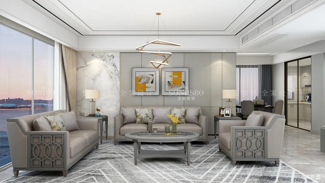客廳在太陽的余暉下襯得柔和樸素,通透自然。超大江景落地窗,引入充足的自然光線灑向屋內(nèi),整體空間去除繁復(fù)的設(shè)計,以柔和的線條作為鋪設(shè),沙發(fā)側(cè)面與地毯中的幾何造型組建了一個極富藝術(shù)感的空間,采用天然實木材質(zhì)制作的家具和織物,色彩淡雅且不張揚。隨處可見的藝術(shù)造型裝飾,無一不展示著美式格調(diào)中輕奢的韻味。
