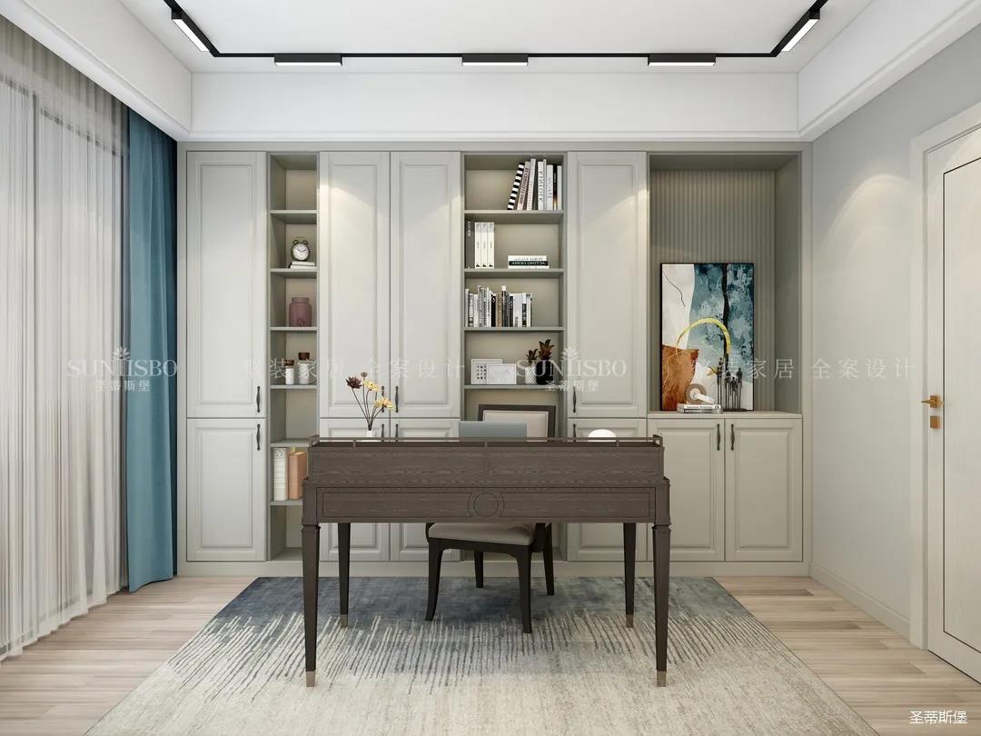 書房以黑白灰,作為打造舒適家居的經(jīng)典配色。深灰書桌,淺灰地毯,仿古白定制書柜,三者搭配帶著與生俱來的時尚藝術(shù)范。整體沒有絢麗多彩的顏色,卻總能令人耳目一新,只一眼便愛上這舒適的閱讀空間。
