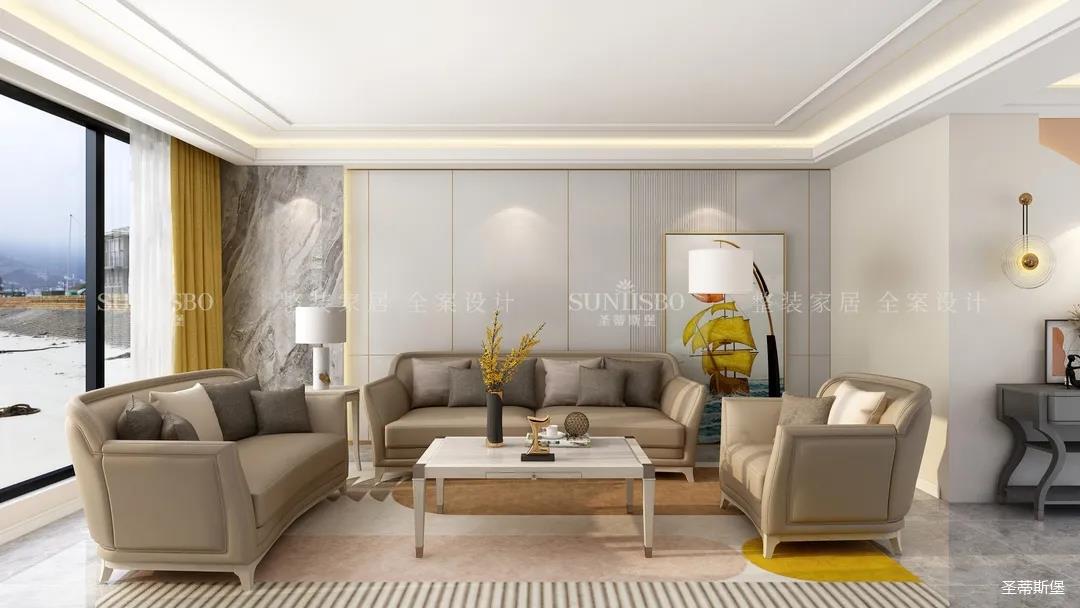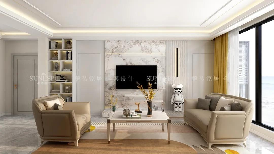 客廳設(shè)計置頂展示柜和大理石,實現(xiàn)了現(xiàn)代和輕奢風(fēng)格間的均衡組合。溫柔莫蘭迪色調(diào)的沙發(fā),細(xì)節(jié)的實木底座和人性化的環(huán)抱式設(shè)計讓空間更添溫馨的氣息。