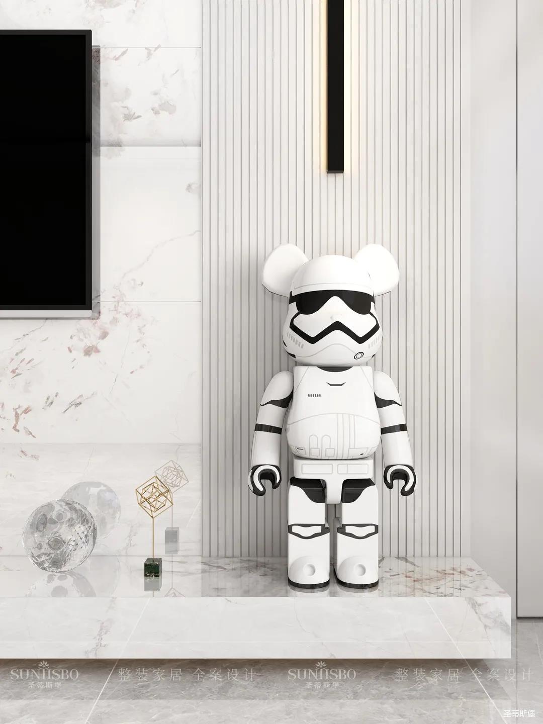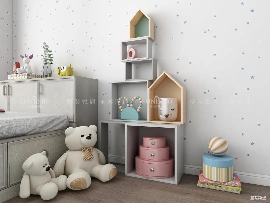 兒童房摒棄了傳統(tǒng)榻榻米的呆板與嚴(yán)肅,延續(xù)主臥輕奢雅致的空間氛圍,以木質(zhì)為主材質(zhì),利用面板的線條帶來視覺上的延伸,將童趣與理性相融表現(xiàn)兒童應(yīng)有的學(xué)習(xí)氛圍與生活習(xí)慣。開放式展示區(qū)應(yīng)用藍(lán)色點綴,再次強(qiáng)化了空間專屬兒童的活躍格調(diào),也呈現(xiàn)了設(shè)計師在材質(zhì)與色彩運用上的精細(xì)與專業(yè)。
