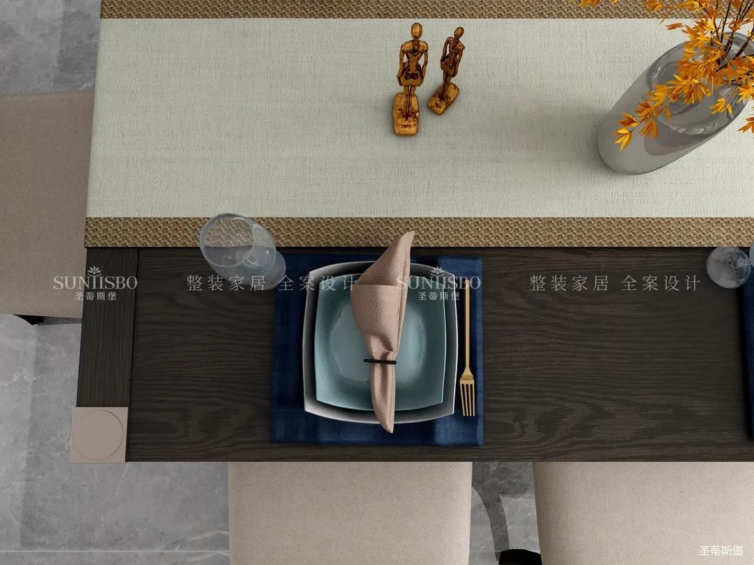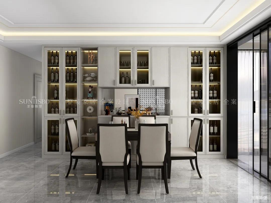 餐廳和客廳以大橫廳的形式展開,設(shè)計師將實木、玻璃、皮質(zhì)、金屬等看似相互排斥的元素相互重組,讓餐廳呈現(xiàn)多元式的輕奢氛圍。深淺色彩,對稱型的定制柜,都讓空間形成強(qiáng)有力的質(zhì)感對比。無論是午餐窗外的車水馬龍,還是晚宴的點點繁星,都能給屋主帶來良好的就餐體驗。