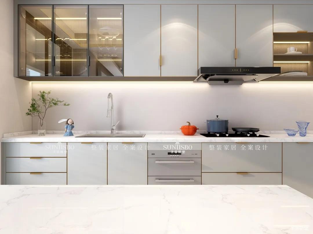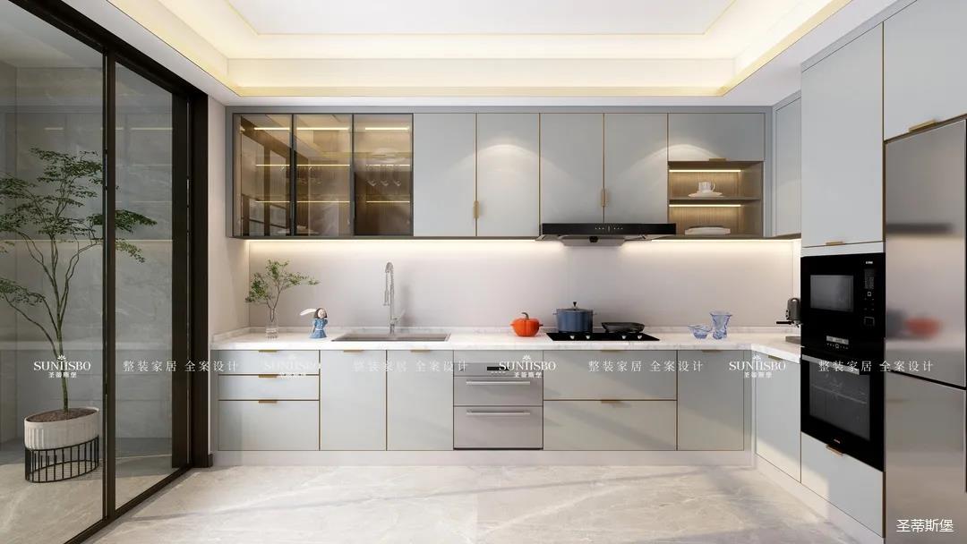 廚房現(xiàn)代智能的設(shè)計(jì)對(duì)精致生活進(jìn)行了全新的詮釋,同時(shí)也呈現(xiàn)了居者追求精簡(jiǎn)生活的內(nèi)涵。智能的廚房電器嵌入同色系的柜體中,時(shí)尚科技感十足。