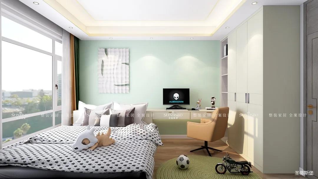 兒童房是清新的淺綠格調(diào),時(shí)尚個(gè)性又不失溫馨舒適。衣柜與墻體深淺色完美匹配整體硬裝,協(xié)調(diào)統(tǒng)一。黑白圓點(diǎn)棉質(zhì)床品與壁畫形成同色系搭配,充盈了空間的飽滿度。