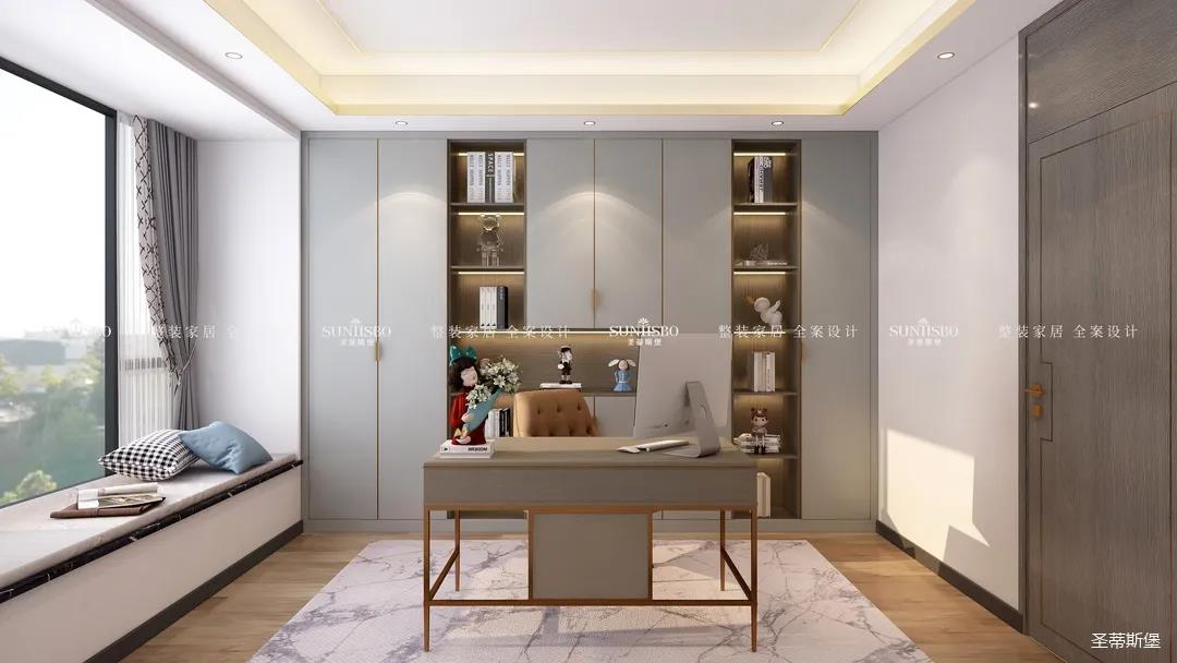 書房以淺灰作為主色調(diào),設(shè)計(jì)師在整個(gè)空間沒(méi)有選擇其他顏色進(jìn)行相互雜糅,讓書房完全釋放了簡(jiǎn)約的風(fēng)格,無(wú)主燈的設(shè)計(jì)理念更是突出了空間層次感。細(xì)膩且富有光澤的金屬元素鑲嵌,在繁華的都市中傳遞著特有的文化氛圍。