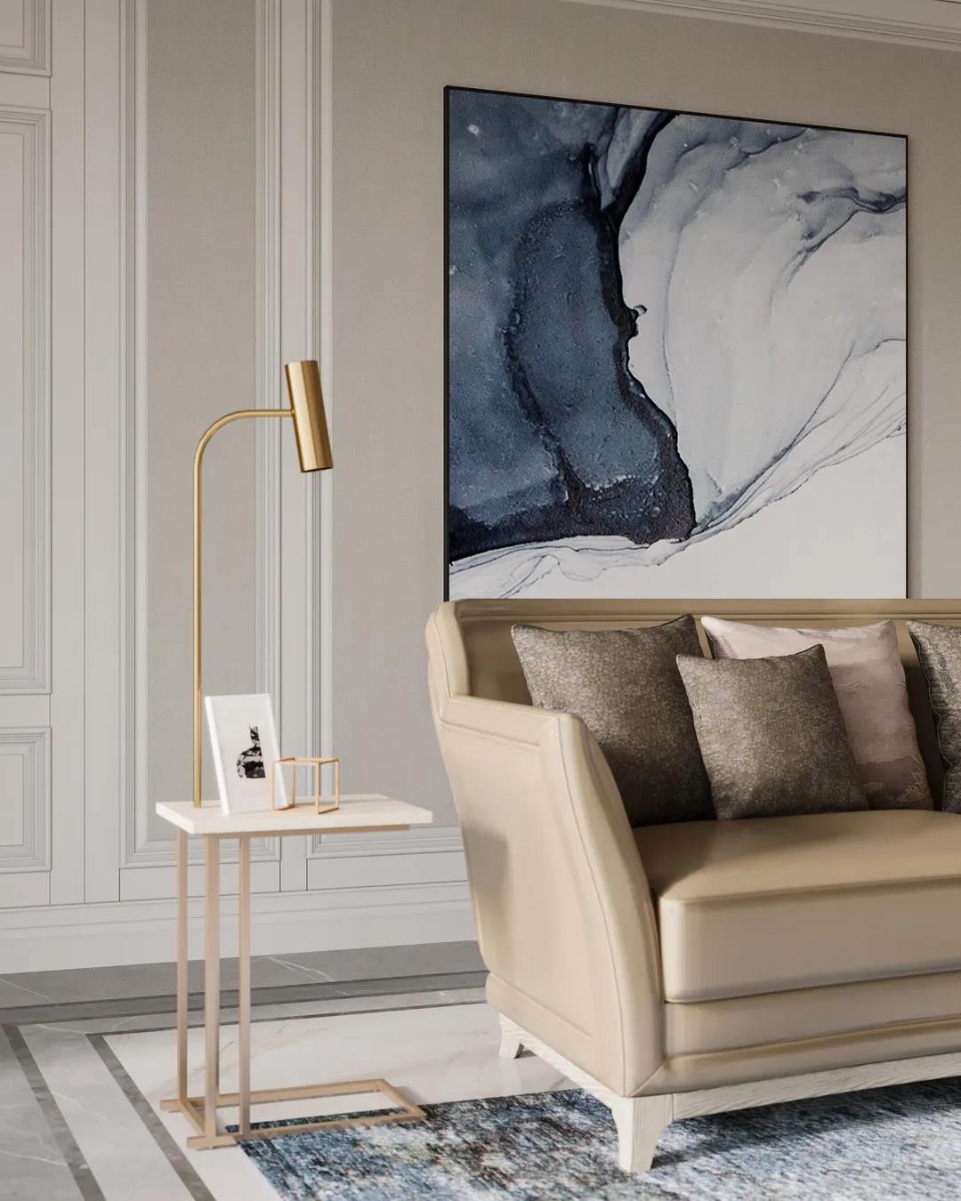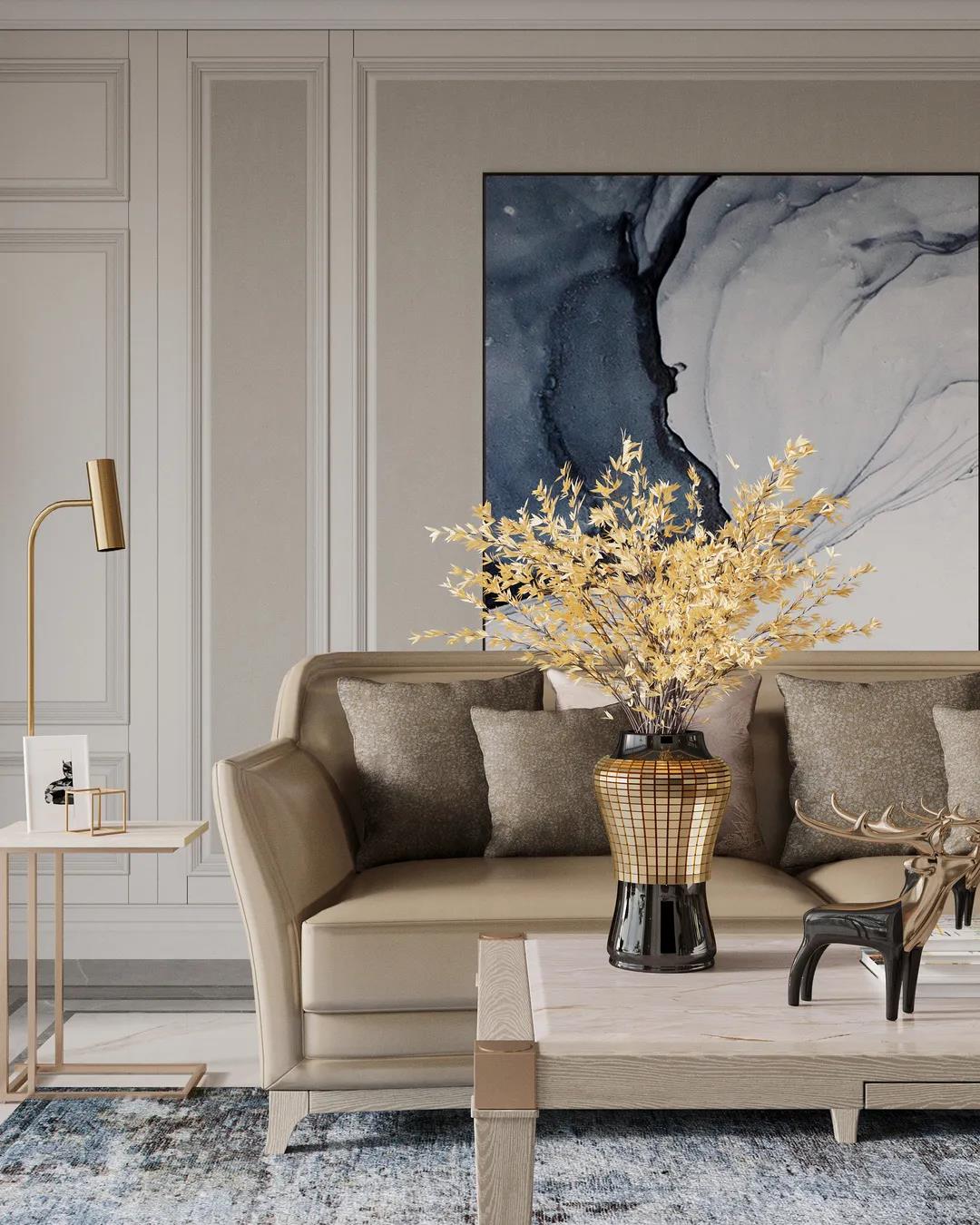 本案定位美式輕奢風(fēng)格,設(shè)計師提取了業(yè)主喜歡的顏色添加至空間中,并運用金屬元素滲透到每一個空間,統(tǒng)一色調(diào)。在設(shè)計上,格局大而不空,以優(yōu)美線條雕琢空間語言,材質(zhì)肌理間的碰撞融合,打造出層次豐富的藝術(shù)感。