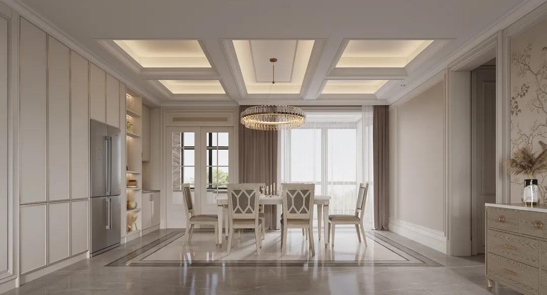 在華麗而精致的餐廳中,仿古白的餐桌椅搭配通透的水晶高腳杯,兩者交相輝映,用餐儀式感十足。墻面的護墻板和酒柜呈現(xiàn)一字型設(shè)計,一方面增添空間整體的豐盈感,還強調(diào)出個性現(xiàn)代的輕奢布局。