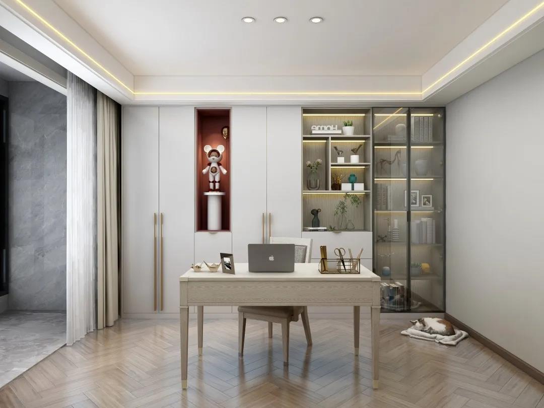 書(shū)柜以虛實(shí)結(jié)合的體塊感呈現(xiàn),疏密不一,相異的色調(diào)在橫縱間碰撞交錯(cuò),演繹靈動(dòng)隨性之美,踱入書(shū)房,這一隅是閱讀、辦公最好的場(chǎng)所。