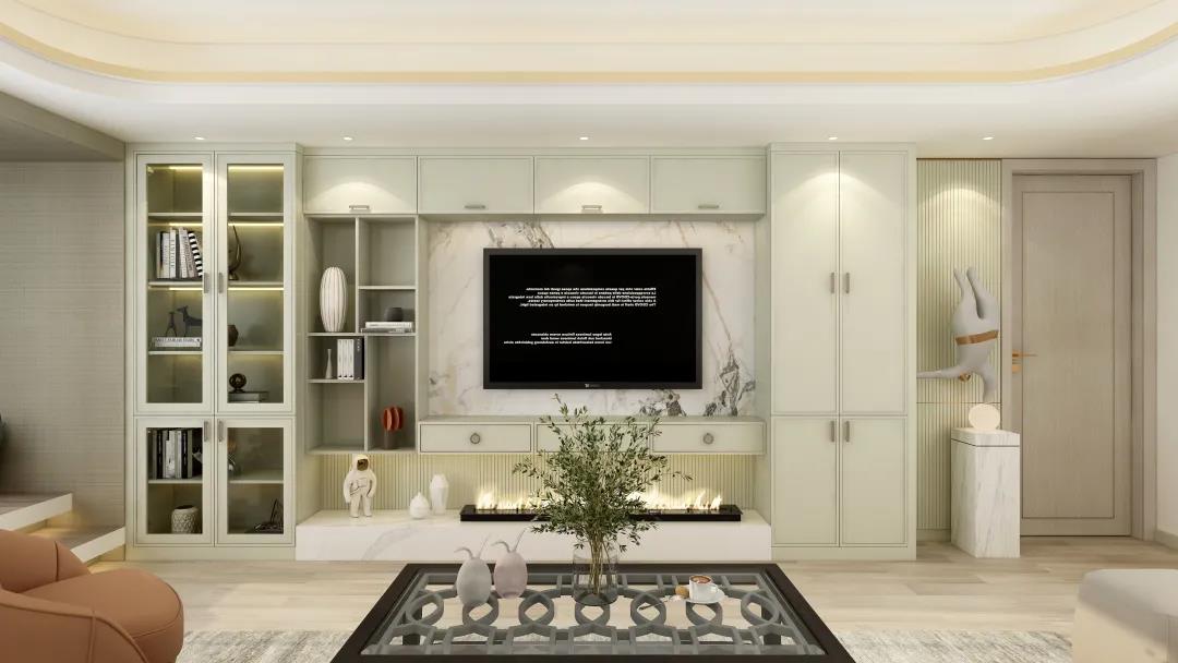 背景墻區(qū)域透過(guò)定制柜的材質(zhì)紋理、立面線條、