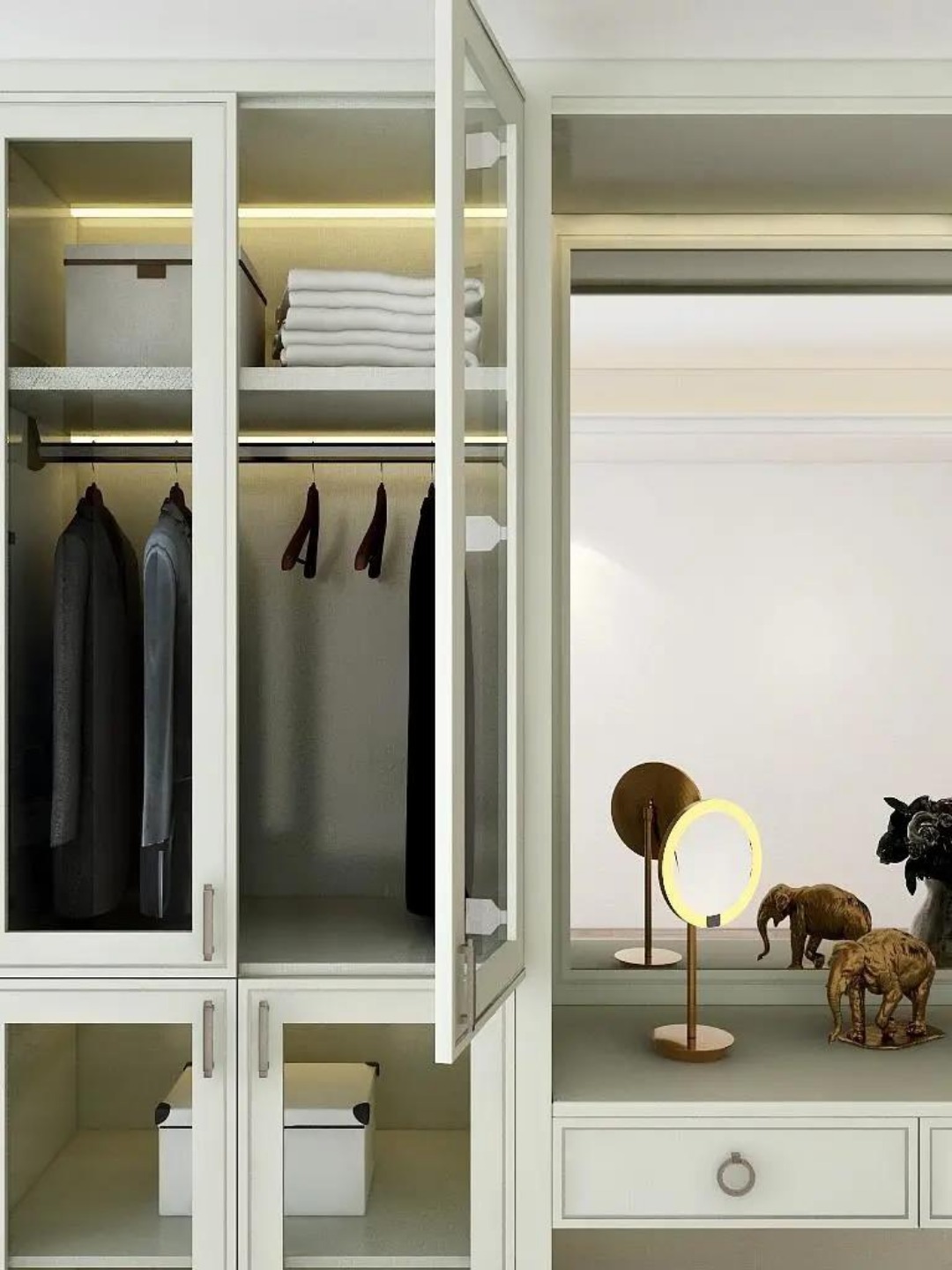 主臥衣帽間的衣柜結(jié)合妝臺(tái)一體設(shè)計(jì),