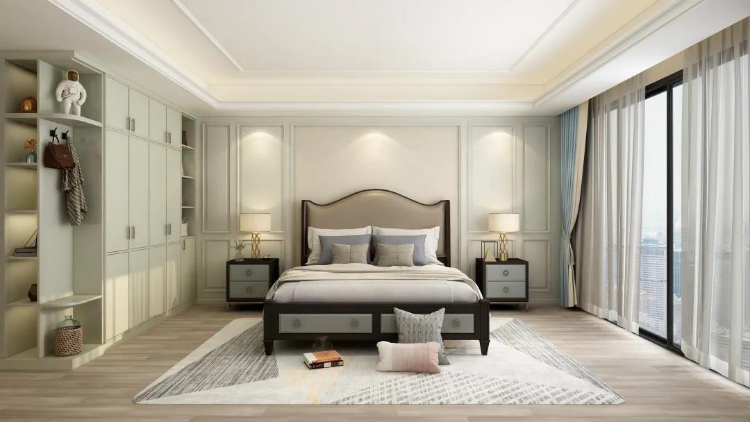 次臥背景墻兩端是對(duì)稱式設(shè)計(jì),以淡雅的暖色為主,