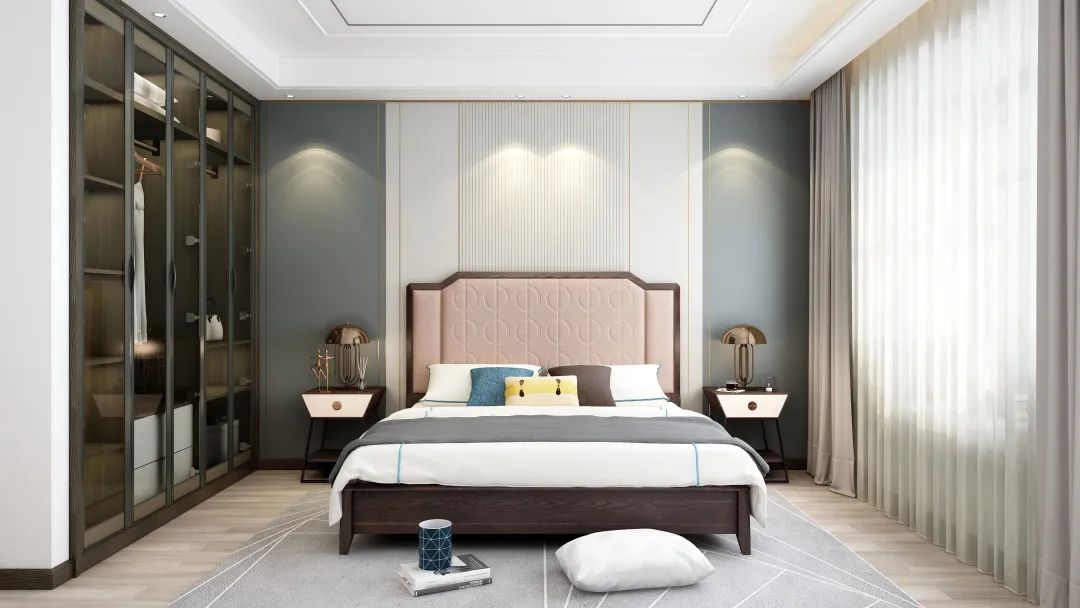 優(yōu)雅沉靜的霧霾藍床架,干凈利索的線條設(shè)計,天然的皮革紋路,與原木色的墻面相呼應(yīng),純粹、樸實,營造出輕奢簡約的氛圍,滿足了屋主對空間的無限暢想。