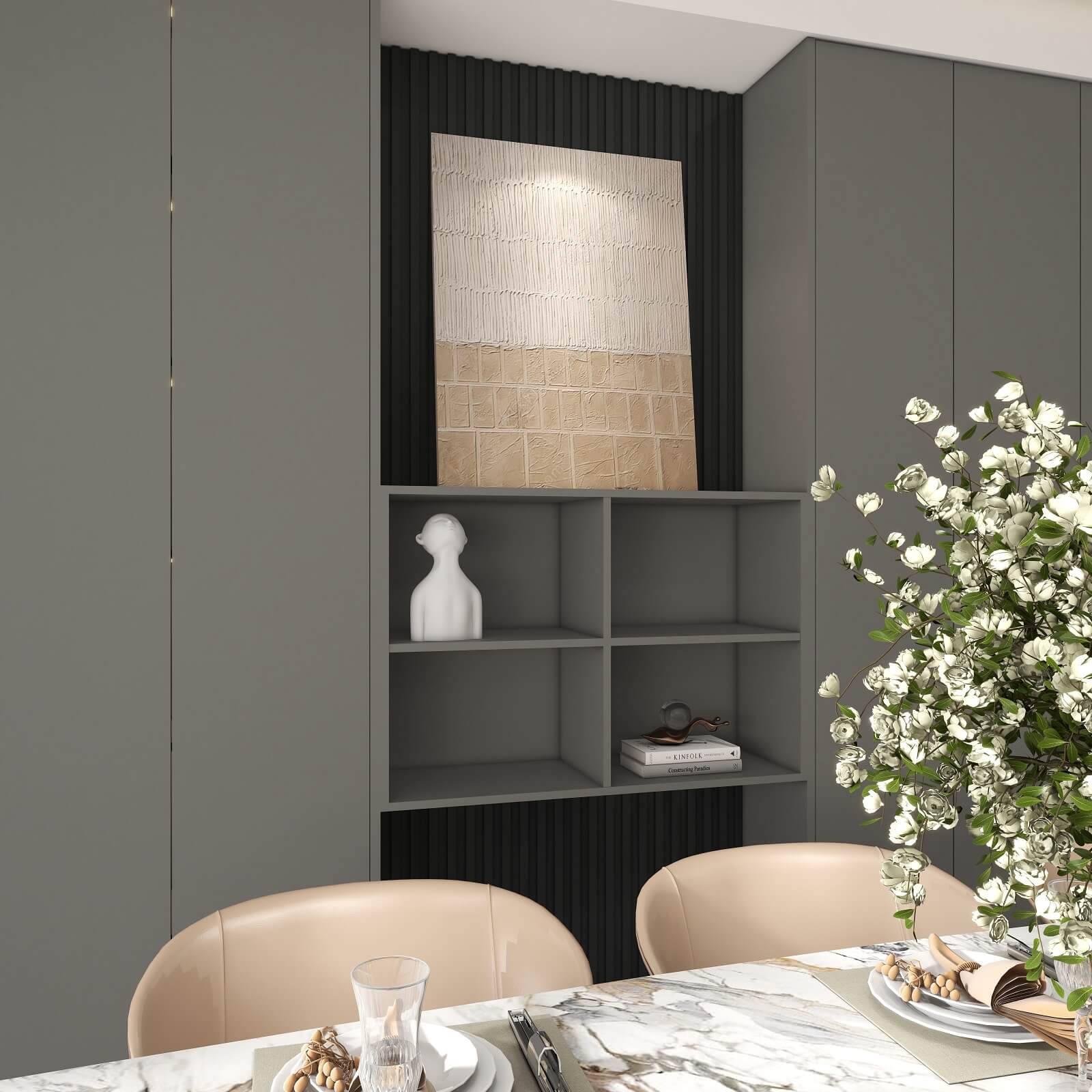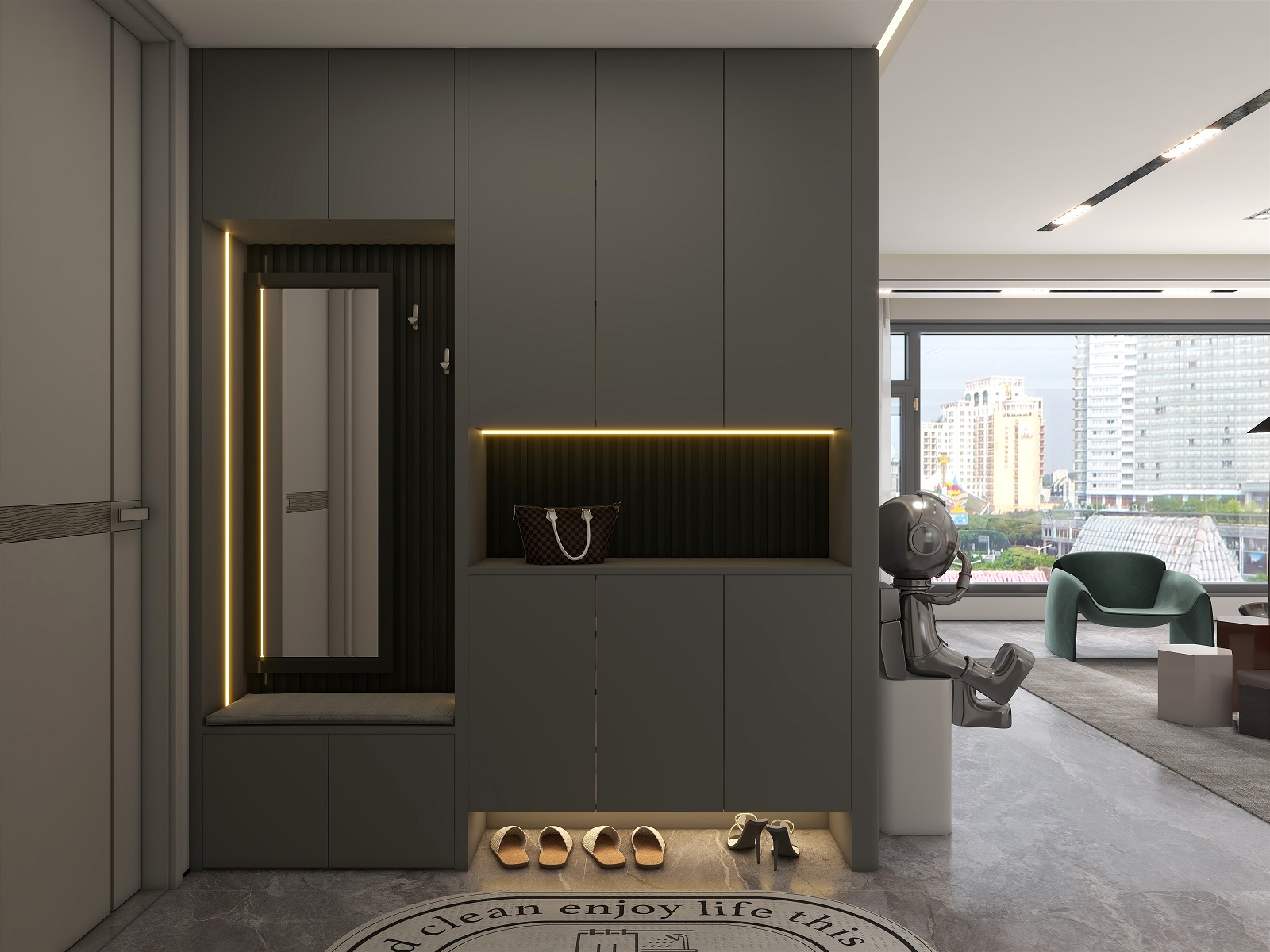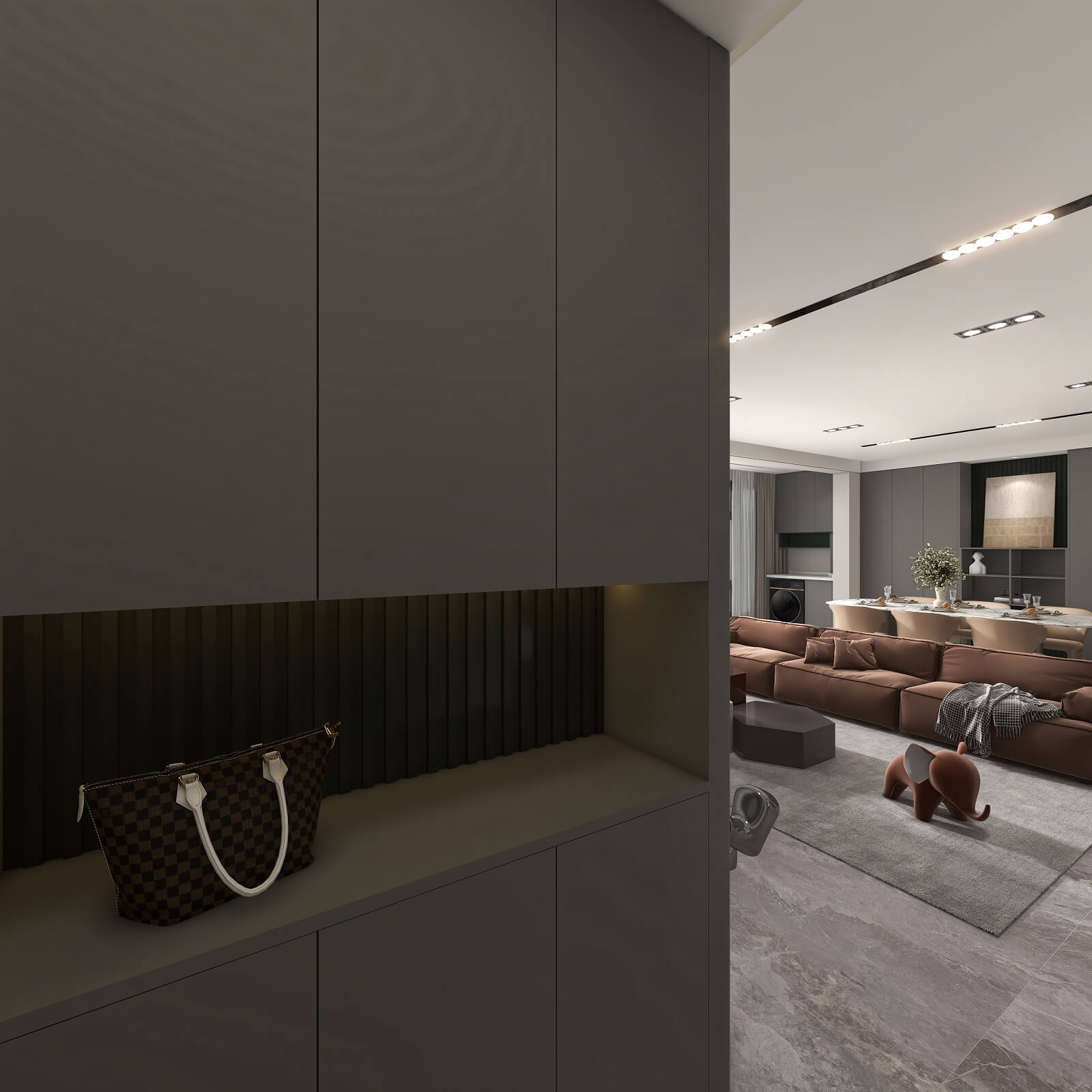 大面積運(yùn)用深灰色,格柵元素極具設(shè)計(jì)感,在層板燈的渲染下整個(gè)玄關(guān)輕奢有內(nèi)涵,給空間增添了幾分自然純粹的氣息,讓人身心放松。