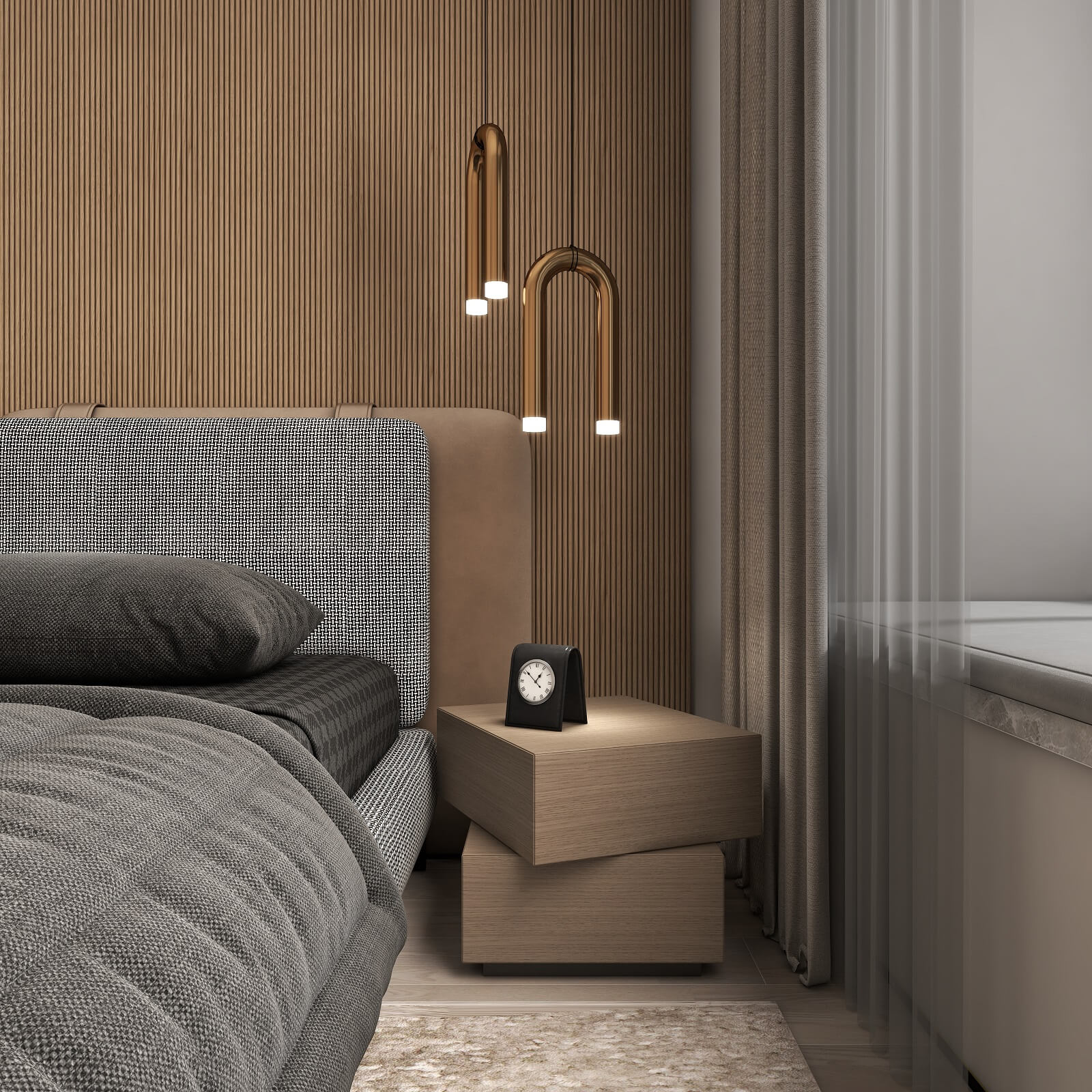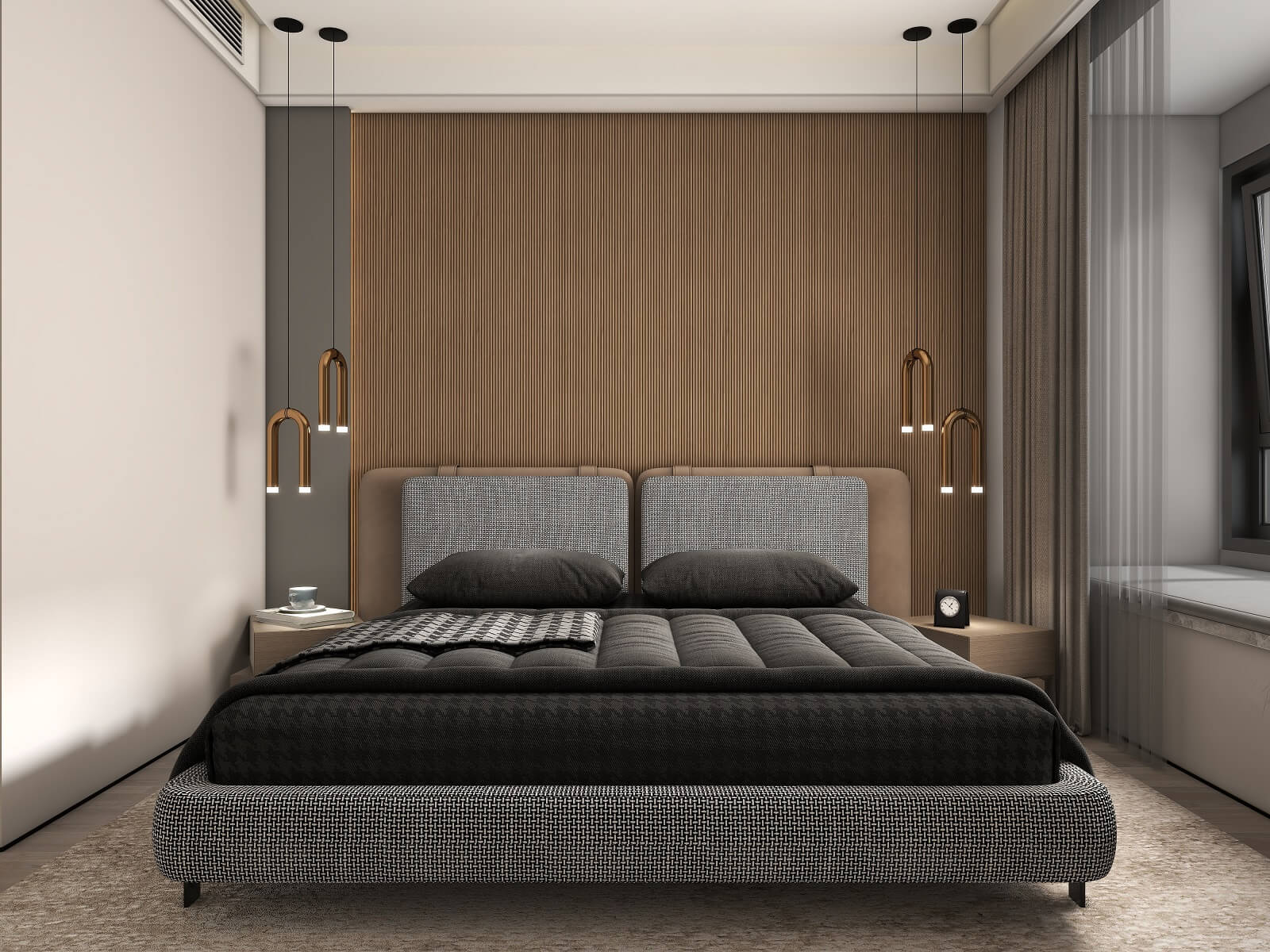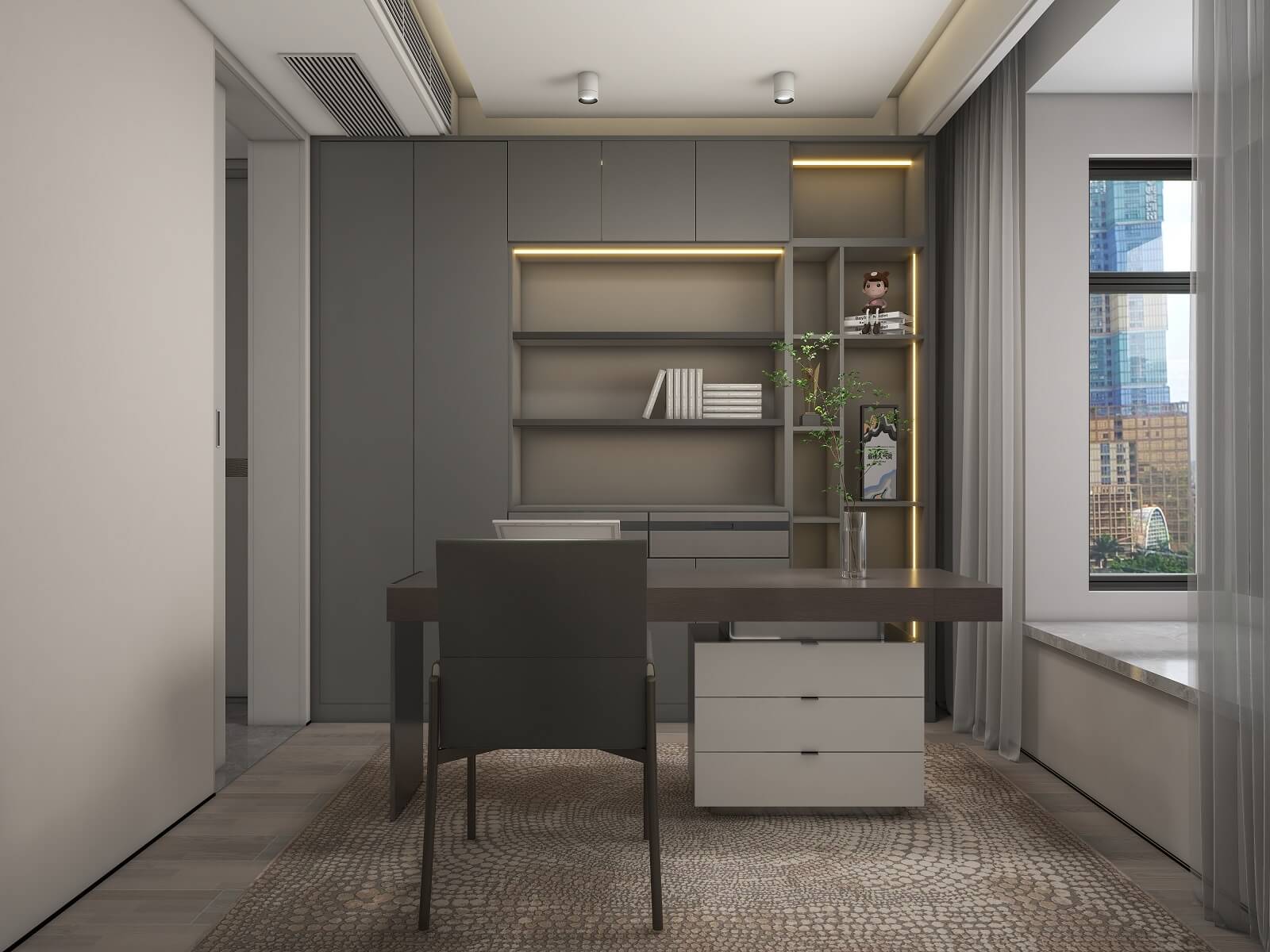 主臥的一切設(shè)計(jì),都有助于睡眠氛圍的營造,黑棕色配合沉靜的物件,從材料到觸感,強(qiáng)調(diào)事物質(zhì)樸的內(nèi)在,能夠展示高端定制木作的本質(zhì)之美。