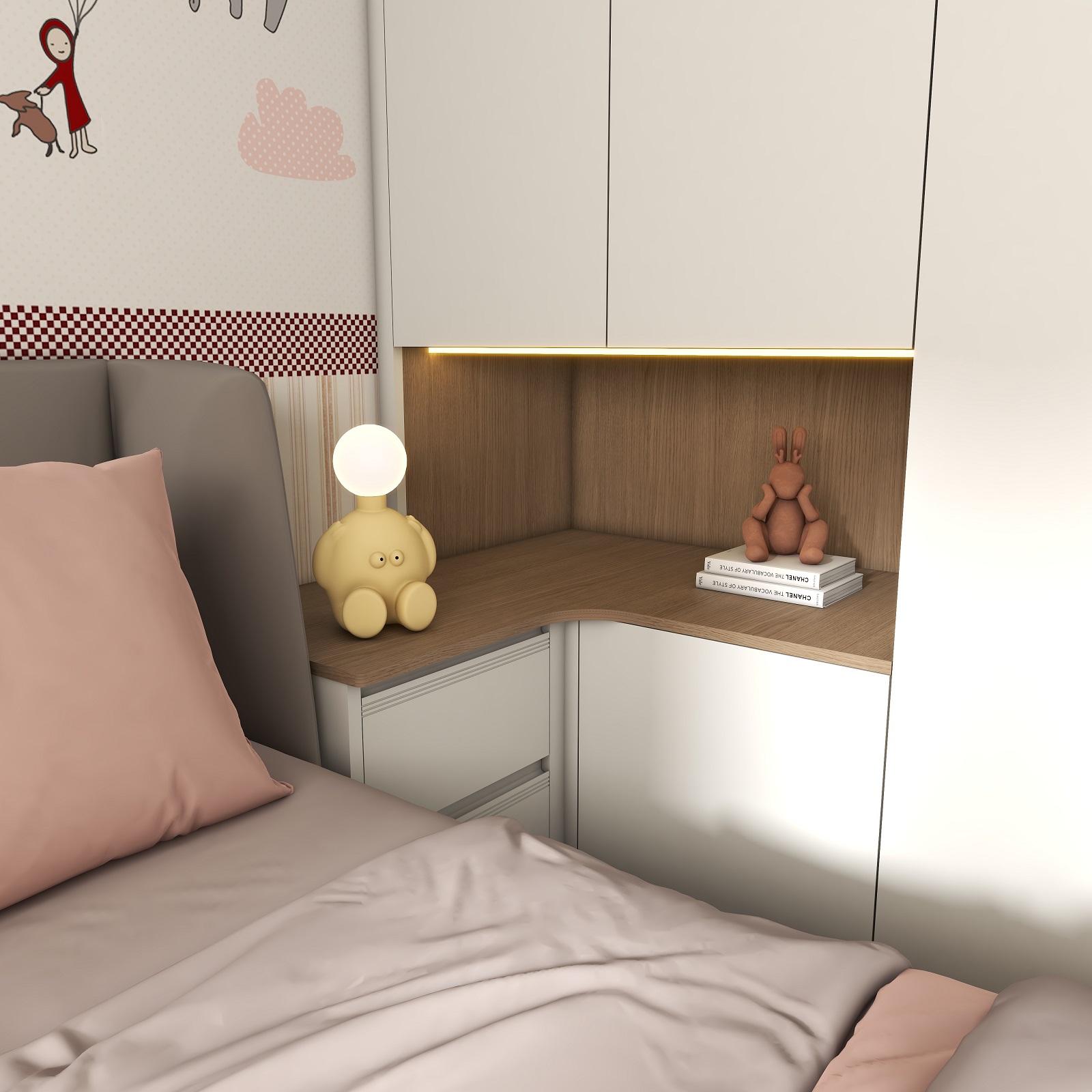 兒童房采用溫柔的奶白作為空間底色,整墻卡通貼畫搭配奶油白衣柜,在細(xì)節(jié)上用粉色裝飾作為跳色,無形中增加立體感和層次感,營造出童真舒適的兒童夢(mèng)中情房。